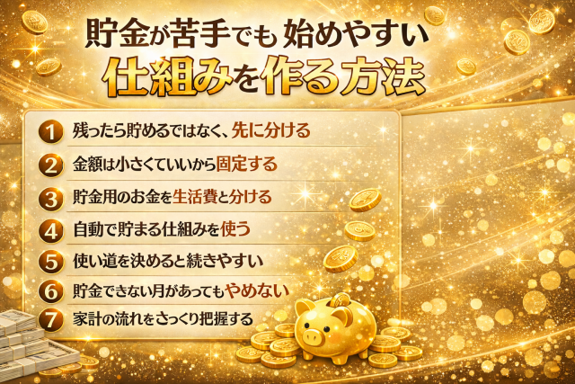 そのため、毎月「頑張って残そう」と考えるより、先に貯まる仕組みを作った方が続きやすくなります。